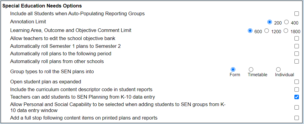 Special Education Needs Options This is used to set the default parameters for SEN data entry. This option is available only for schools using the SEN template. The options are: • Include all Students when Auto-Populating A tick here means that any student can be auto populated in the reporting maintenance section rather than just those that have been tagged in SIS as education support program. • Annotation Limit This can be set as 200 or 400 characters and controls the length of annotations added to photos in the data entry screen. • Learning Area, Outcome and Objective Comment Limit Set the learning area, outcome and objective comment limit to: 600 characters 1200 characters 1800 characters • Allow teachers to edit the school objective bank This allows teachers to edit the school objective bank as well as their own teacher objective bank • Automatically roll Semester 1 plans to Semester 2 Plans in SEN planning will automatically roll over rather than users manually selecting and copying over. • Automatically roll plans to the following period Plans in SEN planning will automatically roll over rather than users manually selecting and copying over e.g. between Semester 2 and Semester 1 the next year. • Automatically roll plans from other schools Plans in SEN planning will automatically roll over from the previous school. • Group types to roll the SEN plans into Select Form, Timetable or Individual. • Open Student plan as expanded In SEN planning all learning areas and objectives will show. • Include the curriculum content descriptor code in student reports When selected, the content descriptor code will be appended to the content descriptor when the SEN report is printed e.g.: "Understand that simple connections can be made between ideas by using a compound sentence with two or more clauses usually linked by a coordinating conjunction (ACELA1467)". • Teachers can add students to SEN Planning from K-10 data entry When selected, teachers will have access to the copy learning area details to SEN icon in the K-10 group data entry window. This icon will allow the teacher to select learning areas from the group that will be reported in SEN. • Allow Personal and Social Capability to be selected when adding students to SEN groupings from K-10 data entry window When selected, teachers will be able to select the personal and social capability content area when selecting group learning areas from the Copy learning area details to SEN function. • Add a full stop following content items on printed and reports When selected, full stops will be included on IEP’s and end of semester SEN reports when the system content descriptors are used.