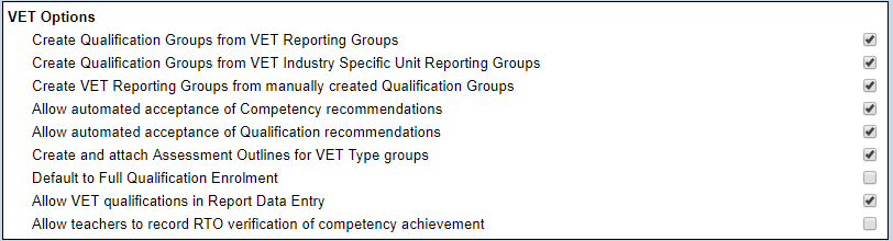When this option is selected, when a VET reporting group is manually created in Reporting Group Maintenance, the ‘create qualification group’ checkbox will default to selected. If a timetabled VET reporting group is auto populated in Reporting Group Maintenance, a qualification group will automatically be created in the VET window.When this option is selected, when a VET Industry Specific reporting group is manually created in Reporting Group Maintenance and the associated VET qualification has been selected, the ‘create qualification group’ checkbox will default to ‘selected’. If a timetabled VET reporting group is auto populated in Reporting Group Maintenance, a qualification group will automatically be created in the VET window.When this option is selected, a manually created qualification group in the VET window that contains students will appear in the Reporting Group Maintenance window as a VET reporting group type.