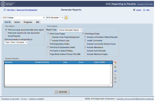 The Generate Reports window is used to print student reports for one or more selected students.
