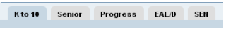 Report type tabs Printing for report types: K to 10, Senior School, Progress, IEC, EAL/D and SEN are managed in separate tabs. To select a report type, click on tab header. Each report type will contain a set of printing parameters that will enable aspects of the report to be managed. Printing parameters are available for: • File Options • Print Options