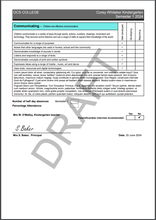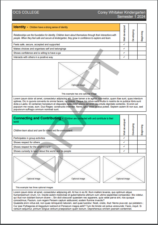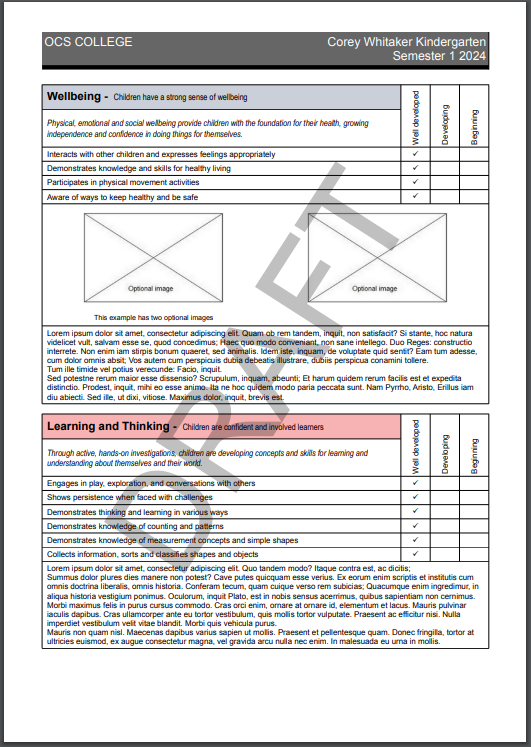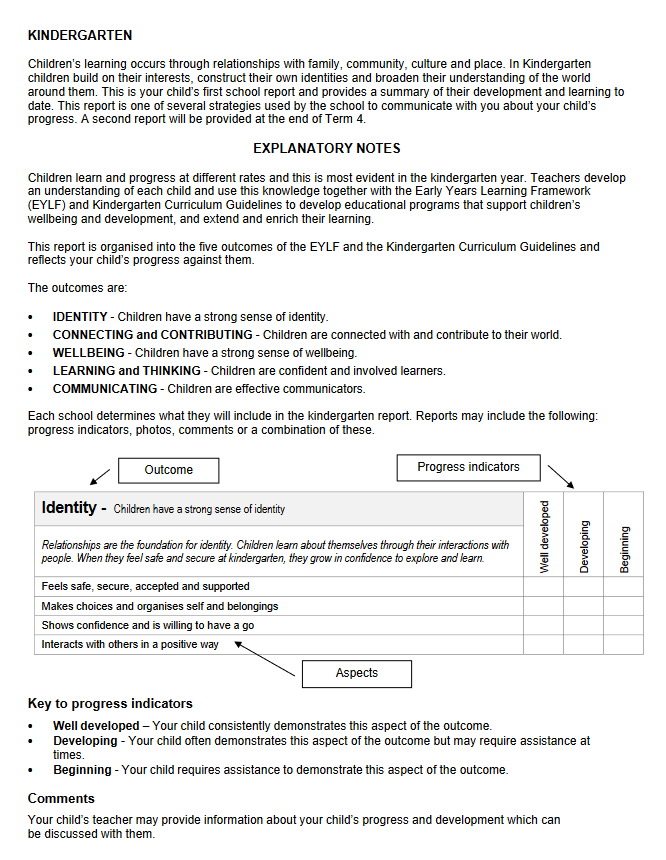 In 2016, in response to requests from schools, the Department approved an optional Kindergarten Report template. A school may choose to use the optional Kindergarten Report template as a part of this plan.