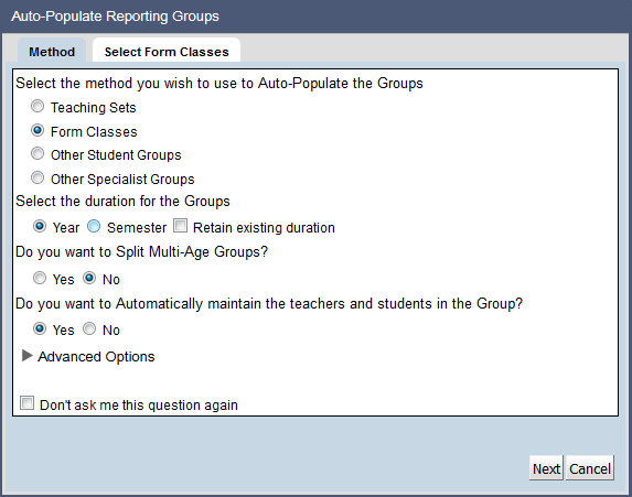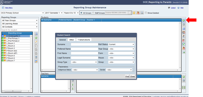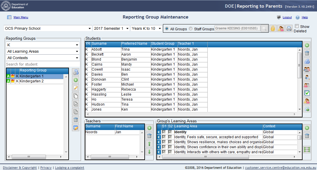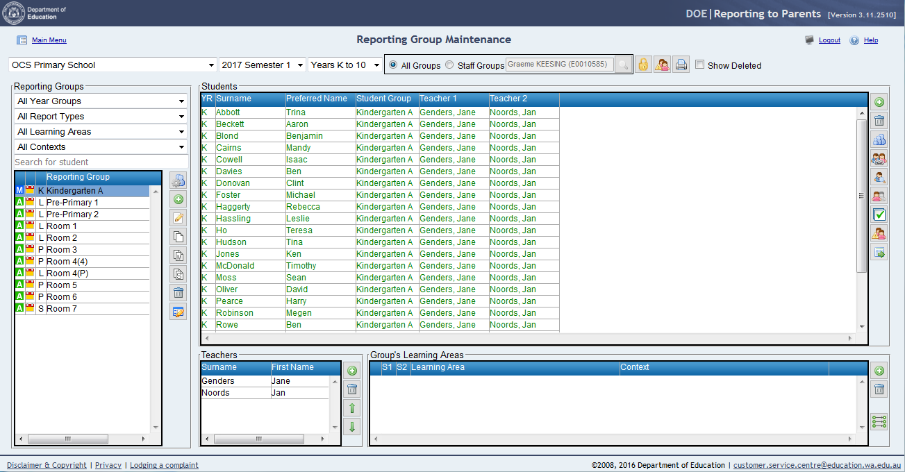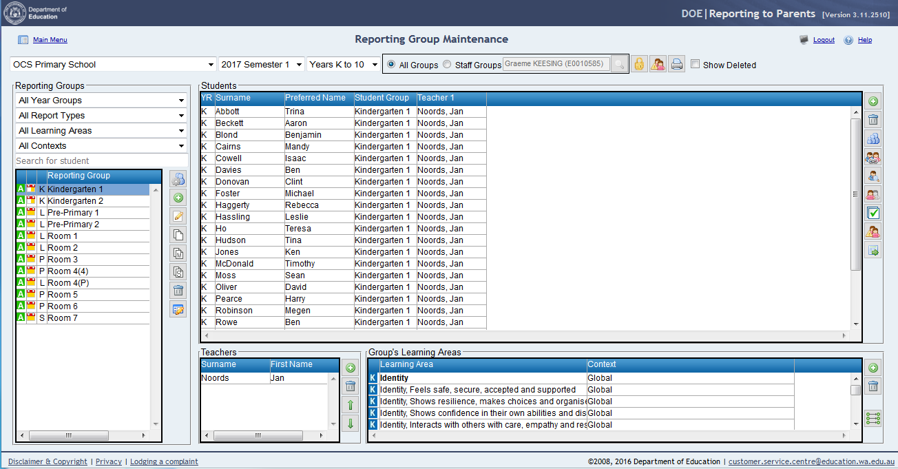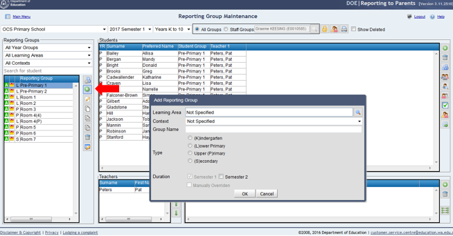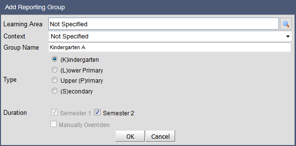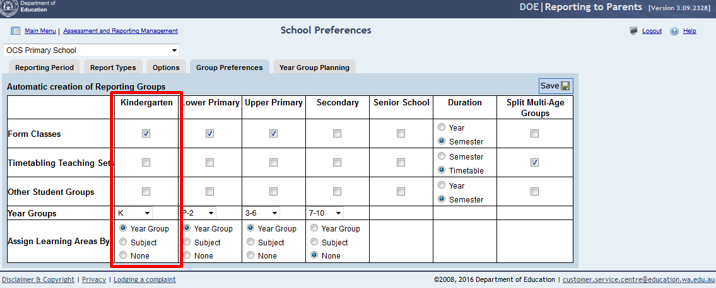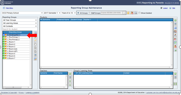 5. Select the Kindergarten Year GroupIf the group preferences and year group planning areas have been correctly defined and Kindergarten students are defined in SIS classes, these classes should appear in the Reporting Group Maintenance window by default and no further changes are necessary.