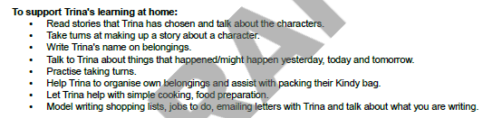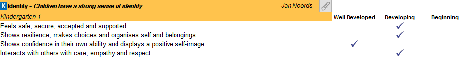 • Developing - Your child often demonstrates knowledge, skills, or dispositions in this area. They may require assistance at times.