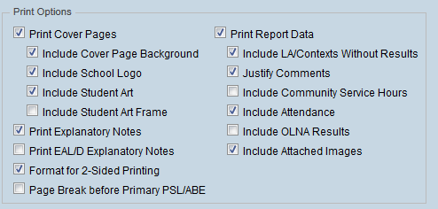 7. Select the Cover Page Art Available on the Kindergarten Report option if either a saved piece of student art or a frame to add art manually is to be printed on the report cover.