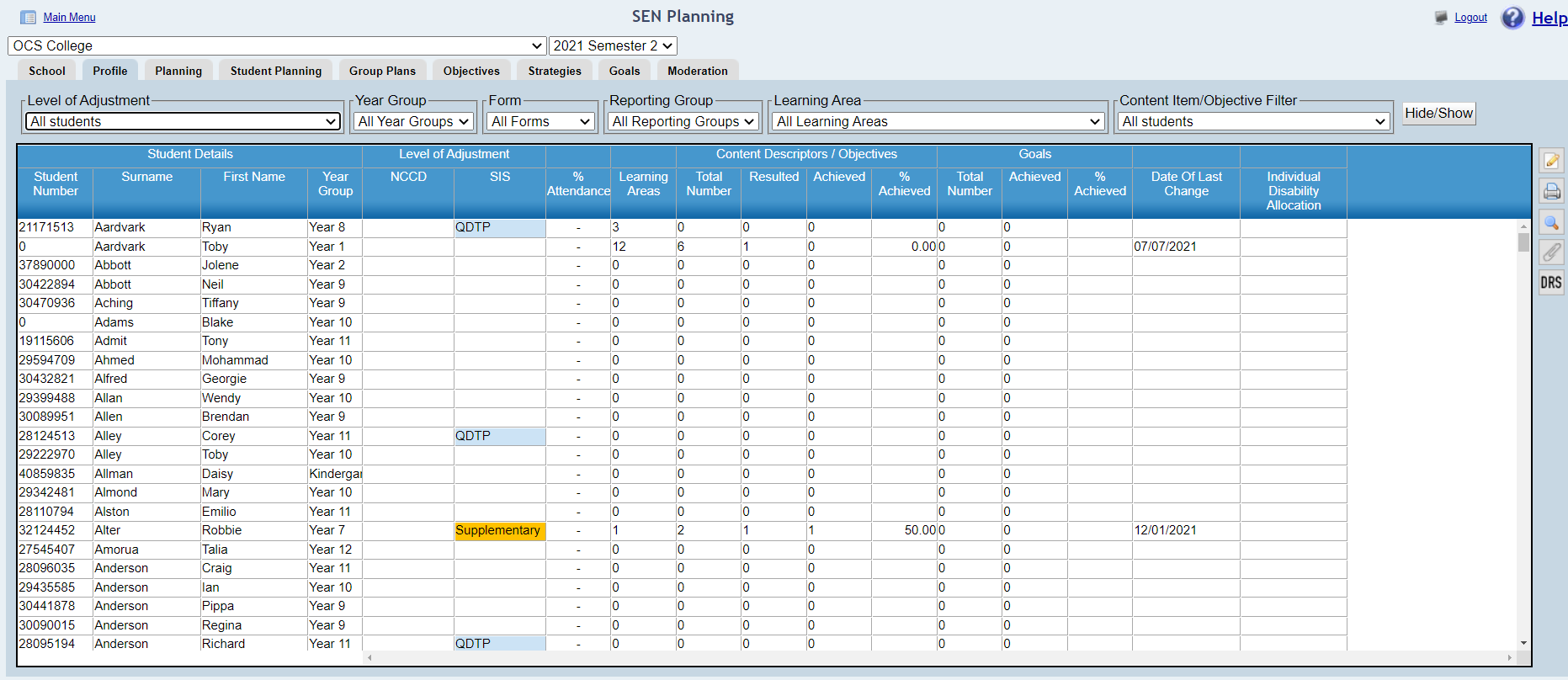 Profile tab The profile tab provides a filtered list of students at the school that will allows SEN activity to be compared with NCCD adjustment data and other indicators. To view the profile data, click on the profile tab. For information regarding the NCCD level of adjustment go to http://www.schooldisabilitydatapl.edu.au/data-collection-steps/step-2---what-is-the-category-of-adjustment