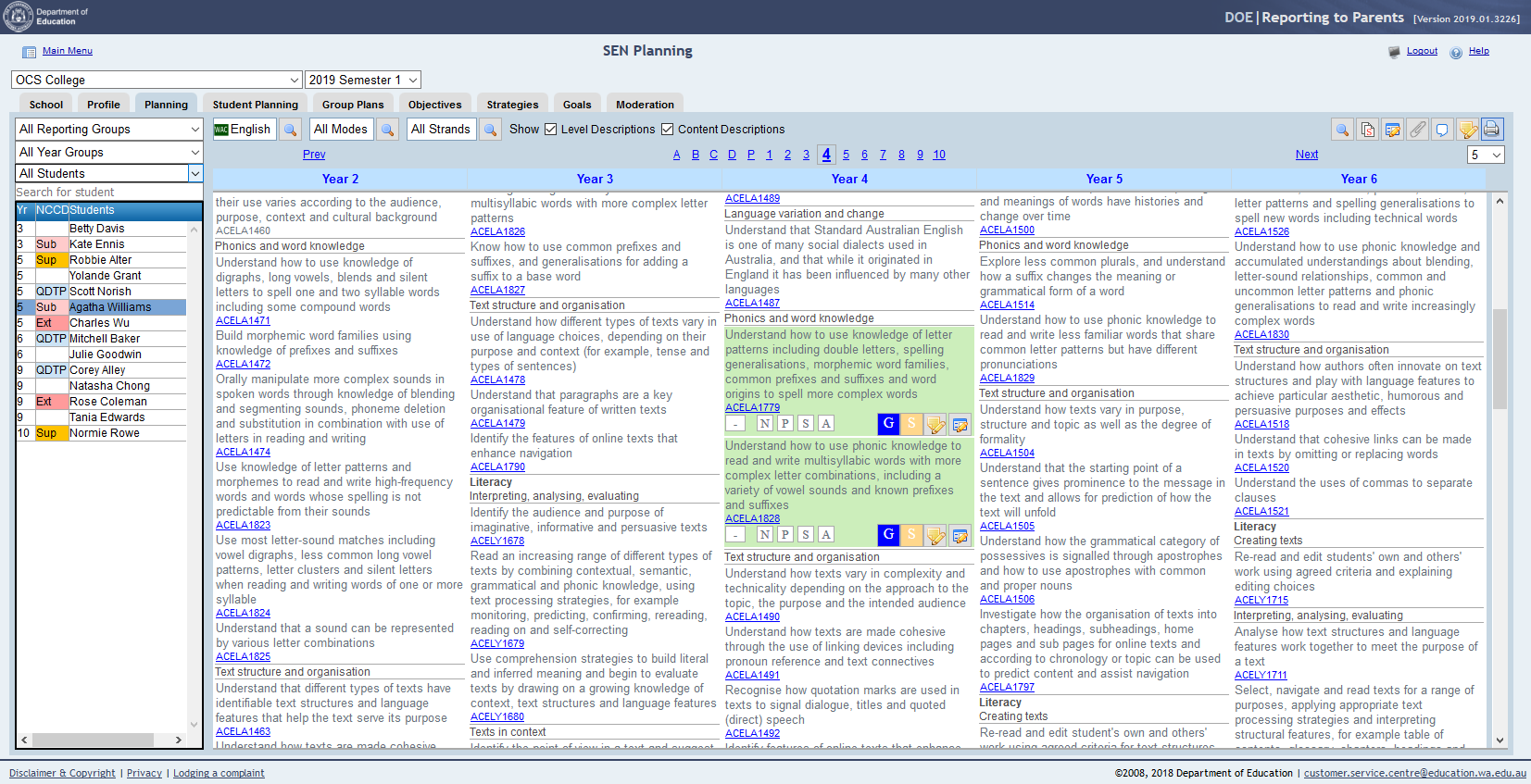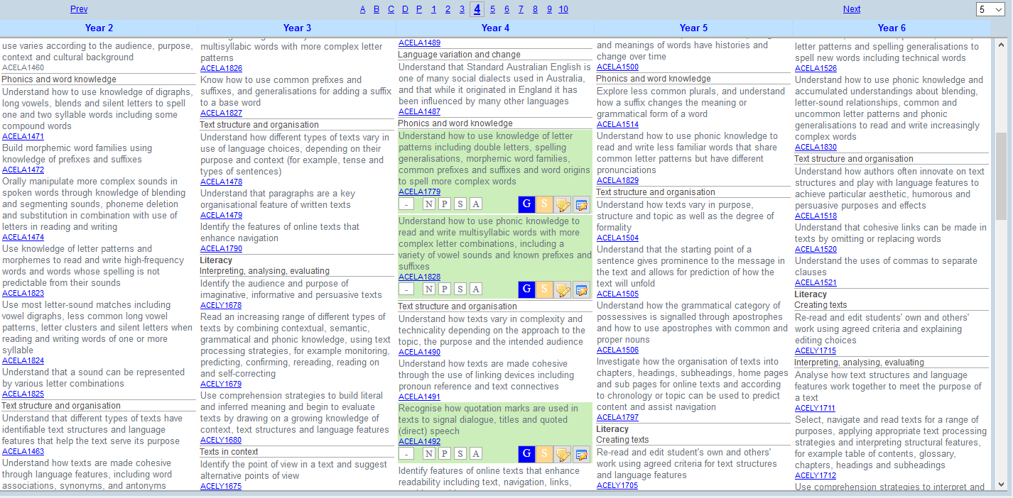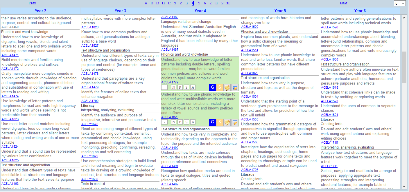 • Click on the appropriate year level (ABLEWA Stages A-D or WA Curriculum P-10) to determine the starting point for curriculum access. The year level selected will appear in the middle column with the year below on the left and the year above on the right.