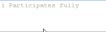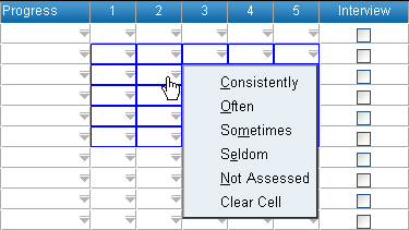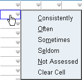 ABE Columns will appear for each of the attitude, behaviour and effort categories. The number of columns will vary depending on whether it is a senior school or 1-10 group. Senior school currently uses 5 categories. The 5 recommended ABE categories are: 1 Participates fully 2 Behaves appropriately 3 Is well organised 4 Meets deadlines 5 Works autonomously The ABE categories can be viewed by: • Hovering over the ABE header. • Clicking in an ABE cell and looking in the footer area at the bottom of the window. ABE data can be entered individually or for multiple cells. To enter ABE individually: 1. Click or tab into the ABE cell. 2. Enter ABE rating using the keyboard by typing the ABE rating short code (usually the first letter) or by clicking on the drop-down menu. • Press enter or click to move to the next cell vertically. • Press tab to move to the next cell horizontally. • Use the mouse to select the next cell. To enter grades for multiple students: 1. Select the required cells by: • Clicking on each cell while holding down the Ctrl key. • Dragging the mouse over the required cells while holding down the left mouse button. • Clicking on the first cell and while holding down the Shift key click on the last cell to choose all cells in between. It is possible to select cells across multiple ABE categories. 2. Right-click on the selected cell 3. Select required rating from the drop-down menu. 4. Click OK to add ABE rating to selected students or Cancel to exit. The ratings will be added to the students. • To remove a rating, select Clear Cell from the grade drop down menu. Sort by ratings by clicking in the column header.