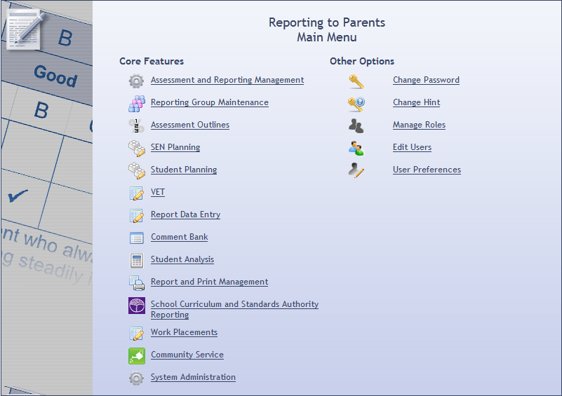 Reporting to Parents functions can be accessed from the Main Menu. The number of menu items available will depend on the role type of the user. The image below represents the full list of menu options to administrators: