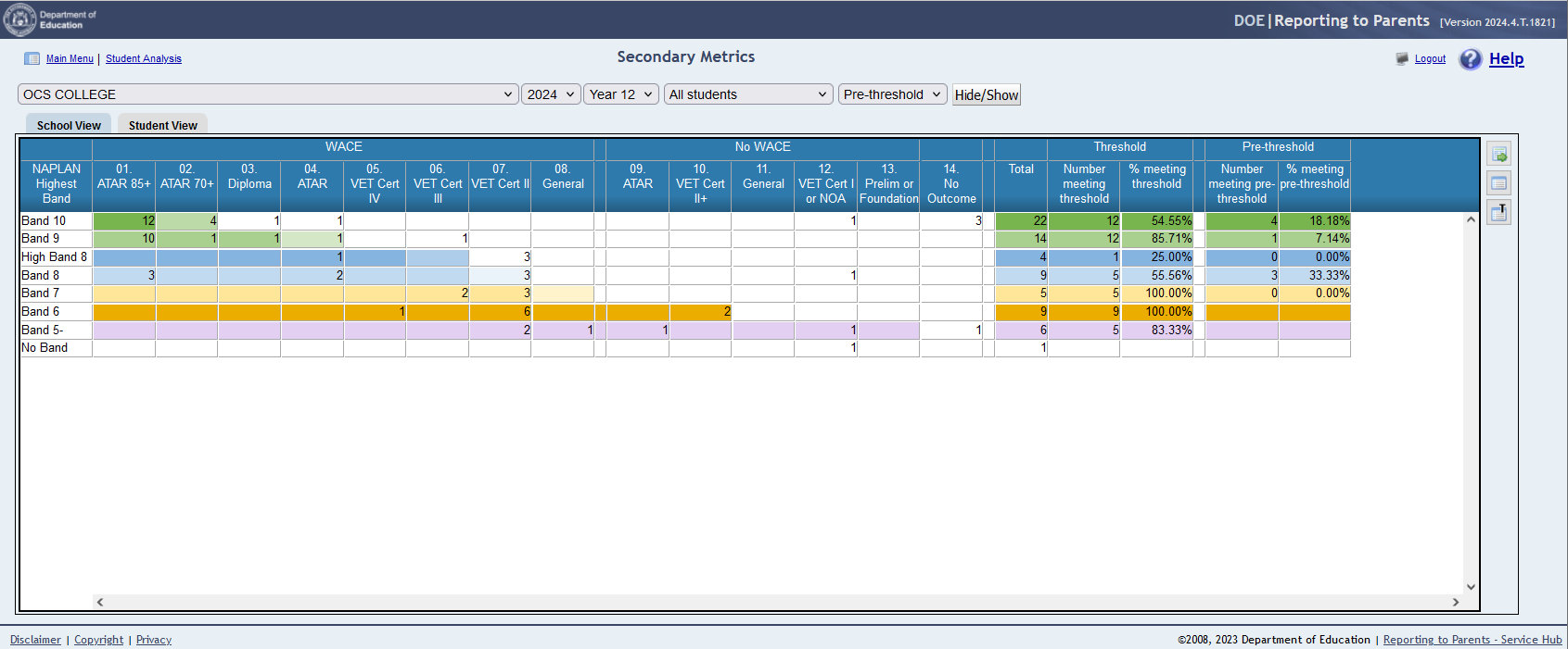 School View The school view provides a summary of student achievement within the academic year cohort for each metric group by NAPLAN weighted score. The school View tab contains: • Metric Group Distribution • Toolbar Functions
