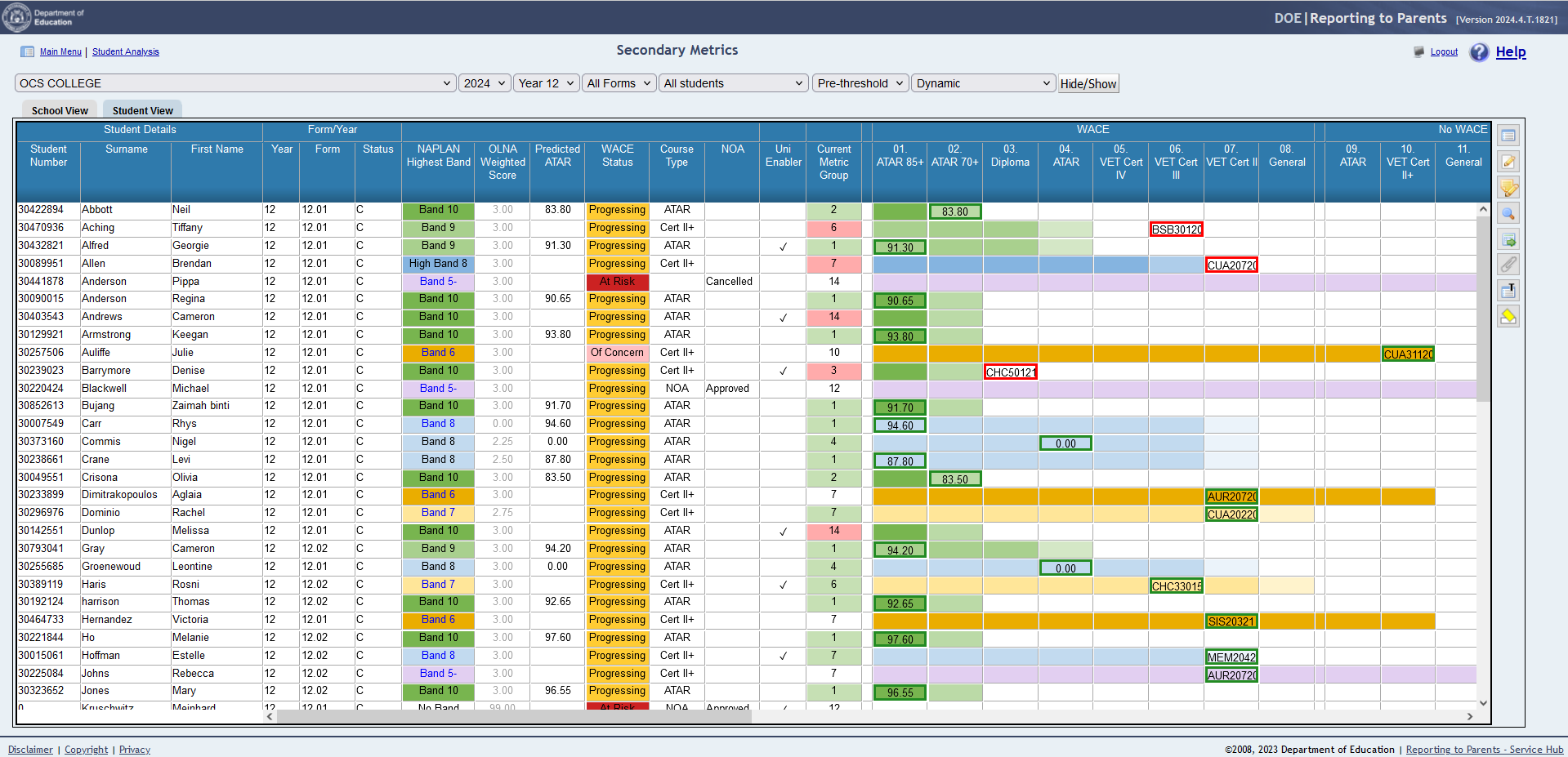 Student View The student view displays each student in the cohort for the selected academic year; a comparison of their NAPLAN Highest Band and threshold metric group range with their calculated metric group based on their course and achievements. Columns can be sorted by clicking on the column headers The fields displayed are: Field Description Student Number The student’s Western Australian Student Number Surname The student’s surname First Name The student's first name Year The student’s academic year level Form The student’s form group Status The student’s roll status in SIS NAPLAN Highest Band/ Proficiency Category The band associated with the highest score achieved in the Year 9 NAPLAN reading, writing or numeracy assessment or the proficiency category based on the proficiency levels. OLNA Weighted Score Calculated using the OLNA achievements at the end of Semester 1 Year 10. If a student has scores in OLNA numeracy, reading and writing: OLNA Weighted Score= OLNA Numeracy * 0.5 + OLNA reading * 0.25 + OLNA writing * 0.25 If a student has only one of OLNA reading or writing: OLNA Weighted Score= OLNA Numeracy * 0.5 + OLNA (reading or writing) * 0.5 If the student does not have scores for numeracy and at least one of reading and writing: OLNA weighted score = 99 Scores associated with OLNA achievements are: Result Score Pre-qualified (Q) 3 Pass 3 Cat 2 2 Cat 1 1 NSA 0 Predicted ATAR The predicted ATAR uses school-based achievements and applies predictions for scaling, moderation and standardisation based on historical data from each school site. The predicted ATAR includes the application of ATAR bonuses for language courses, Mathematics Methods and Mathematics Specialist. The predictions are calculated by SAIS using the latest achievement in the courses currently taken by the student. The scores that used in the prediction process can be seen by hovering over the predicted ATAR. WACE Status The progress towards WACE achievement calculated by the WACE Tracker. Statuses are: Status Description Achieved The student has the course and results that will allow the achievement of the WACE. Note: The WACE achievement calculated by the SCSA may differ if enrolments and achievements are not uploaded to SIRS or a student does not sit the external examination for ATAR courses. Progressing The student has a program that will enable them to achieve the WACE At Risk The student does not have a program and achievements that will allow them to achieve the WACE. Course Type A categorisation of the student’s course. These are: Category Description ATAR The student is enrolled in 4 or more ATAR courses. Cert II+ The student is enrolled in a certificate II or higher qualification and is not enrolled in 4 or more ATAR courses. General The student is enrolled in 5 General courses or a combination of General up to 3 ATAR courses or equivalent** and does not satisfy the requirements for ATAR or Cert II+. Note**: Up to 2 units of endorsed program can be used. NOA The status of any Notice of Arrangement (NOA) records for the student. Hover over the status for details regarding the notice. NOA statuses are: Status Description Approved The NOA has been approved. Cancelled A previously approved NOA has been cancelled. Rejected An NOA application has been rejected. Pending An NOA application is being processed. Uni Enabler A tick will be displayed when the student has an enrolment in a Uni-enabler program. Hover over the tick for a display of the programs that the student is enrolled in. 01. WACE & ATAR 85+ Has achieved or is on track to achieve the WACE and has a predicted ATAR of 85 or higher. 02. WACE & ATAR 70+ Has achieved or is on track to achieve the WACE and has a predicted ATAR of 70 or higher and less than 85. 03. WACE & Diploma Has achieved or is on track to achieve the WACE and is progressing towards the achievement of a VET Diploma and does not have a predicted ATAR of 70 or higher. 04. WACE & ATAR Has achieved or is on track to achieve the WACE, has a predicted ATAR, and is not progressing towards the achievement of a VET Diploma. 05. WACE & VET Cert IV Has achieved or is on track to achieve the WACE, is progressing towards a Certificate IV, does not have a predicted ATAR and is not progressing towards the achievement of a VET Diploma. 06. WACE & VET Cert III Has achieved or is on track to achieve the WACE, is progressing towards a Certificate III, does not have a predicted ATAR and is not progressing towards the achievement of a VET Diploma or Certificate IV. 07. WACE & VET Cert II Has achieved or is on track to achieve the WACE, is progressing towards a Certificate II, does not have a predicted ATAR and is not progressing towards the achievement of a VET Diploma, Certificate IV or Certificate III. 08. WACE & General Has achieved or is on track to achieve the WACE, does not have a predicted ATAR of 50 or higher and is not progressing towards the achievement of a VET Diploma, Certificate IV, Certificate III or Certificate II. 09. No WACE & ATAR Is not on track to achieve the WACE and has a predicted ATAR. 10. No WACE & VET Cert II+ Is not on track to achieve the WACE and is progressing towards the achievement of a Certificate II or higher and does not have a predicted ATAR. 11. No WACE & General Is not on track to achieve the WACE has General courses, does not have a predicted ATAR and is not progressing towards the achievement of a Certificate II. 12. No WACE & VET Cert I or NOA Is not on track to achieve the WACE and is progressing towards a VET Certificate I or has an approved NOA, does not have ATAR or General courses and is not progressing towards the achievement of a Certificate II or higher. 13. No WACE & Prelim or Foundation Is not on track to achieve the WACE and is progressing towards completion of Preliminary or Foundation courses, does not have an approved NOA, ATAR or General courses or is progressing towards the achievement of a Certificate I or higher. 14. No WACE & No Out