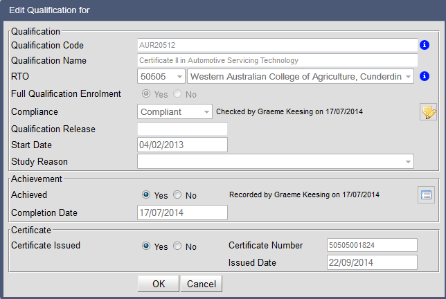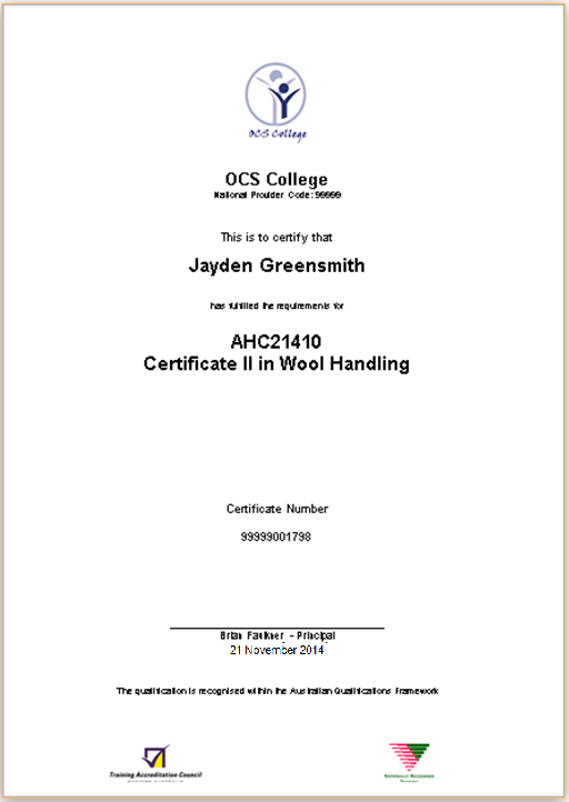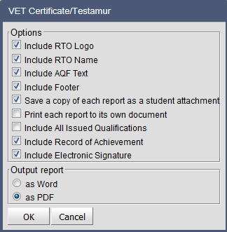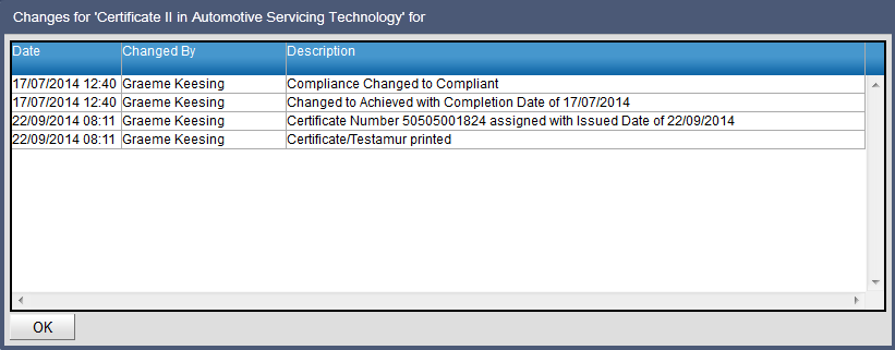 Print Certificate/Testamur – For RTO Schools Only The Print Certificate/Testamur function will only appear for RTO schools and is only active for qualifications delivered by the school as the RTO. Only qualifications that have been achieved and have been issued with a certificate number can be printed. To print the Certificate (Testamur): 1. Select the student qualifications that have been issued. 2. Click on the Print Certificate/Testamur report icon. 3. Select the required options. Option choices will be determined by the choice of printing on pre-printed stationary or printing a full certificate with all required components. When the ‘Include RTO Logo’ or ‘Include RTO Name’ options are de-selected, the RTO logo and name will not be included so that pre-printed stationary can be used. When the ‘include footer’ option is selected, this will print the required TAC, AQF and NRT logos. When the ‘include AQF text’ option is selected, if the ‘include footer’ option is also selected, only the TAC and NRT logos will be printed. The “Save a copy of each report as a student attachment” option defaults to selected. A copy of the printed statement of attainment will be placed in the student document store. If the “Print each report to its own document” is selected a zip folder of individual reports will be returned rather that a single file containing all reports. If the ‘Include electronic signature’ option is selected, this will use the electronic signature uploaded and stored in RTOs > Edit RTO Details > Add RTO signature. 4. Click on OK. A sample report is shown below: If a certificate is printed, a record will be recorded in the certificate log. To access the certificate log: 1. Select the Student Qualification. 2. Click on the Edit Qualification icon. 3. Click on the Show History of Changes icon. Records of changes made to the status of the qualification will be recorded including a record of the qualification being printed.