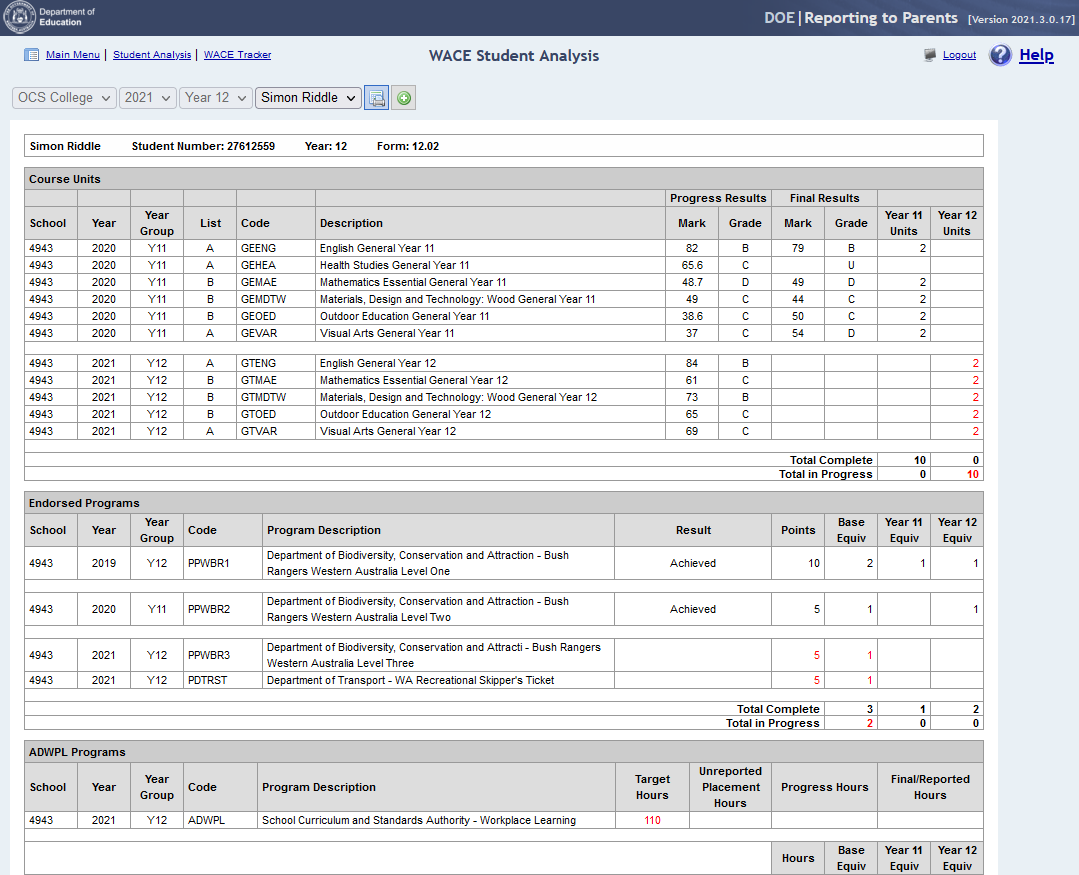 WACE tracker – student analysis The WACE tracker – student analysis window provides detailed information about the progress of a student towards meeting the requirements of the WACE. This includes: • Course Unit enrolments and results • Endorsed program enrolments and results • VET qualification enrolments and results • An analysis of the WACE Eligibility requirements • An analysis of Breadth and Depth requirements • An analysis of Achievement requirements • An analysis of Literacy and Numeracy requirements All details that have been recorded in Reporting to Parents regardless of school will be shown. Duplicate enrolments in units may be shown where a student is transferring between schools. Results may not be available if a student has previous achievements recorded in a non-government or non-Reporting to Parents school. To view the WACE student analysis: 1. Select one or more students on the WACE Tracker Summary screen 2. Click on the View Details Analysis icon The WACE student summary screens will open and display details for the first student selected. • Selecting Students • Printing the WACE Tracker – Student Analysis • Adding Data from Non-Reporting to parents Schools • Course Units • Endorsed programs • ADWPL Programs • VET • WACE Eligible Requirements • Breadth and Depth Requirements • Achievement Standards Requirements • Literacy and Numeracy Assessment Requirements