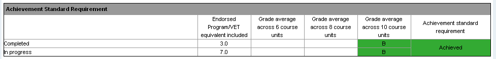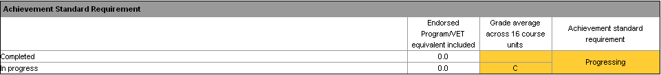 Achievement standard requirement The achievement standard calculates a grade average based on completed units or a prediction including those not yet completed. The table will differ slightly depending on the graduating calendar year of the selected students. 2010 and 2011 requirements • Achieve a C grade average or better across 10 course units • These 10 units must include: the last two-unit combination completed in three different courses one unit from each of two other different courses other units with the highest achievement to make up the balance of the 10 units. • Endorsed programs and/or VET credit transfer can reduce the number of course units and courses required by up to 40 per cent. See Section 6 for details. The rules used to calculate these values are: Endorsed Program/VET equivalent include The sum of the completed equivalences for Endorsed programs and VET and P Stage. Course grade average across 6 course units The best of the last 3 two-unit combinations across 3 different courses. The grade average is determined by converting grade to a score, averaging and translating to a grade Progress score or the completed half of a pair will be used to predict and calculate the in progress average. Course grade average across 8 course units The best of the last 3 two-unit combinations across 3 different courses and the best single unit in two other courses. Course grade average across 10 course units The best of the last 3 two-unit combinations across 3 different courses and the best single unit in two other courses and the best two additional units with the highest achievement. Achievement standard achieved If Endorsed Program/VET/P Stage equivalent included total of completed and in progress is o < 8 use result from Grade average across 10 course units o >= 8 and < 10 use the result from Grade average across 8 course units o >= 10 use the result from Grade average across 6 course units o Green and “Achieved” if all requirements are green o Amber and “In progress” if all components are green or amber with at least one amber o Pink and “Of Concern” if all components are green or amber with at least one amber and there are two or more marks less than 50%. o Red and “At risk” if any component is red. 2012 and beyond requirements • Achieve a C grade average or better across the best 16 course units of which at least 8 must be completed in Year 12 • Endorsed programs and/or VET credit transfer can reduce the number of course units and courses required by up to 6 units. The rules used to calculate these values are: Endorsed Program/VET equivalent include The sum of the completed equivalences for Endorsed programs and VET and P Stage Course grade average across x course units The number of units used in the grade calculation will depend on the reduction due to Endorsed, VET and P Stage units. The number will vary between 10 and 16 units. Achievement standard achieved If Endorsed Program/VET/P Stage equivalent included total of completed and in progress is: o < 3 use the result from Grade average across 16 course units with 8 in year 12 o 4 use the result from Grade average across 14 course units with 6 in year 12 o 5 use the result from Grade average across 12 course units with 6 in year 12 o 6 to 9 use the result from Grade average across 10 course units with 6 in year 12 o 10 or more use the result from Grade average across 10 course units with 4 in year 12 o Green and “Achieved” if all requirements are green o Amber and “In progress” if all components are green or amber with at least one amber. o Pink and “Of Concern” if all components are green or amber with at least one amber and there are two or more marks less than 50%. o Red and “At risk” if any component is red.