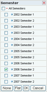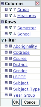 Column - Click this icon, next to a data set name, to move the data set into the Column group. Row - Click this icon, next to a data set name, to move the data set into the Row group. Filter - Click this icon, next to a data set name, to move the data set into the Filter group. Demote - Click to demote (move down) a data set within the Column or Row groups. Promote - Click to promote (move up) a data set within the Column or Row groups. OK Button - When you have completed configuring the query using the OLAP Navigator, clicking OK will close the Navigator and run the new query. The results table is redisplayed based on the new query. Cancel Button - Cancels the current operation (filter or query definition). Returns you to the previous screen. Close - Cancels the current operation (filter or query definition). Returns you to the previous screen. Select and Deselect - When editing a Column or Row definition, can be clicked to Select (blue circle) or Deselect (red circle) a data set. Once selected, the data set can be moved within the list using the Paste after and Paste before icons. Paste after - Moves the selected data set (see Select icon above) to the position immediately after the data set that is adjacent to the clicked icon. Paste before - Moves the selected data set (see Select icon above) to the position immediately before the data set that is adjacent to the clicked icon. Expand and Collapse - Where data sets are displayed as a tree of sets and subsets, these icons can be used to Expand (plus icon) or Collapse (minus icon) a set. Group and Flat Buttons - Some data sets have been organised into predefined groups and sub-groups. None or All Buttons - Enables you to select None or All checkboxes when configuring Column or Row data sets.The OLAP Navigator is displayed above the query results.