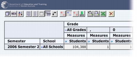 Select the Query Parameters.The Analysis Results screen is displayed.The query results are presented on this screen in a spreadsheet format. The toolbar that is displayed above the results is the Mondrian toolbar.You can now use the Mondrian tools to analyse the query results, and you can export the results to a Microsoft Excel file.