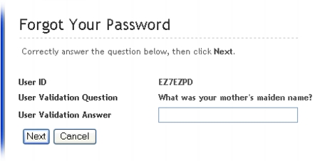 Enter your answer (exactly as you typed it when you set up the User Validation Question and Answer) in the User Validation Answer text box.The second screen of the Forgot My Password wizard is displayed.